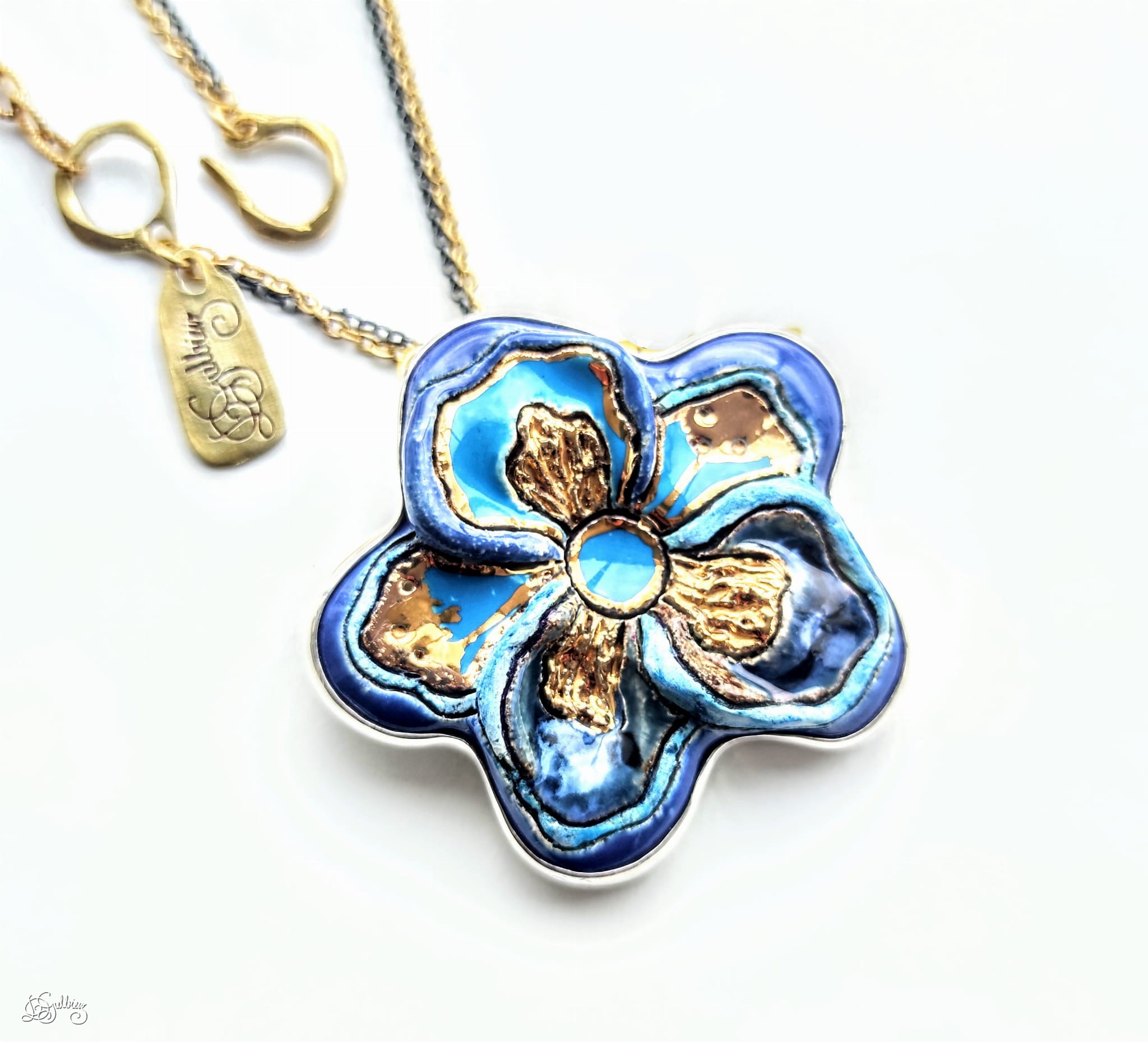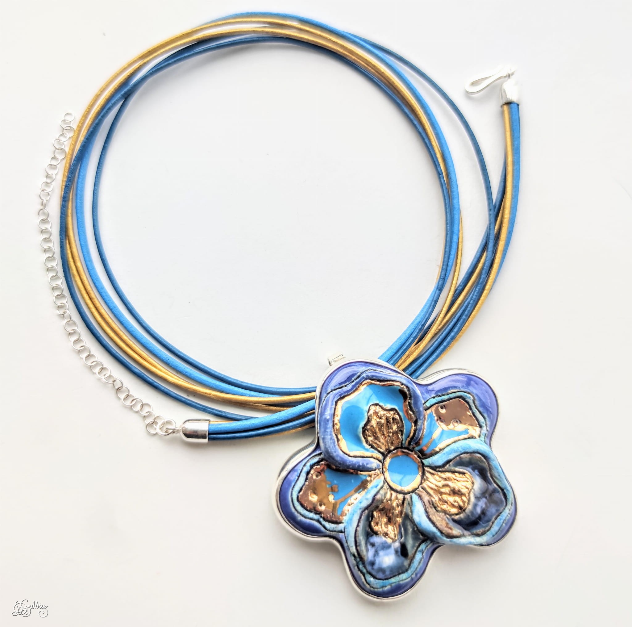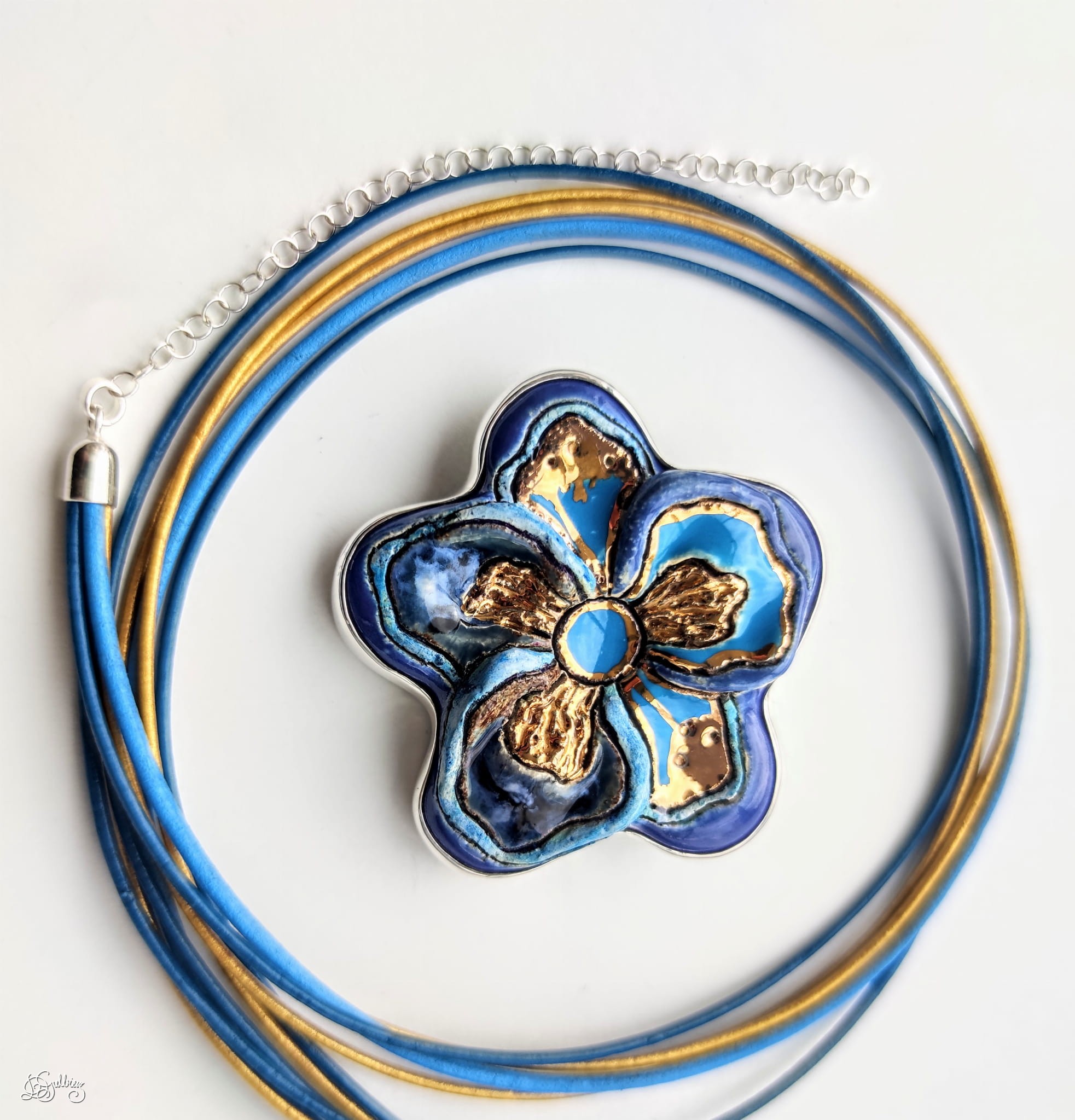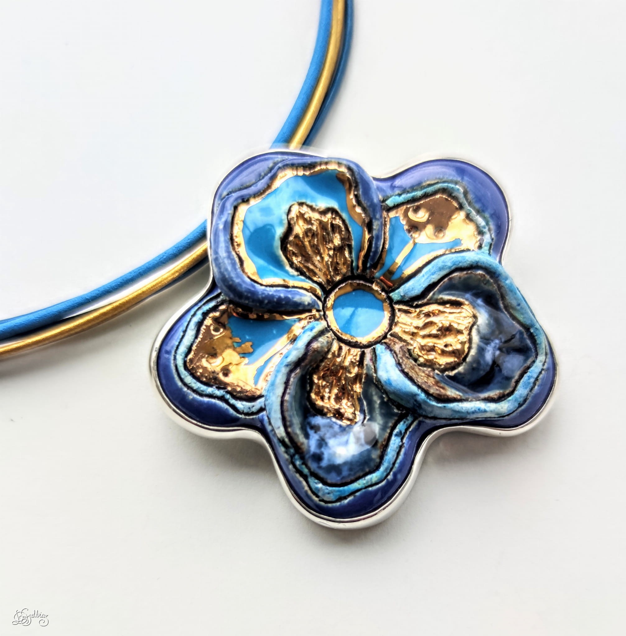 Bratek Blue #4 to naszyjnik ze srebra i ręcznie rzeźbionej, malowanej i złoconej ceramiki. Rzeźbiony ręcznie w autorskiej technice ceramicznego reliefu naszyjnik został pomalowany szkliwami w odcieniach błękitu oraz miejscowo pokryty złotem. Wielokrotnie wypalane porcelanowe wnętrze kwiatu oprawione w polerowane srebro i zawieszone na pęku rzemieni może być ozdobą codziennego stroju i wieczorowej sukni. Błękit, złoto i srebro tworzą spójną całość i znakomicie podkreślają kobiecą urodę nadając jej szyku.
