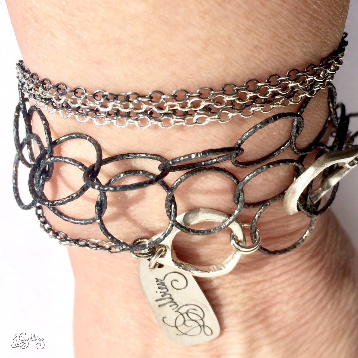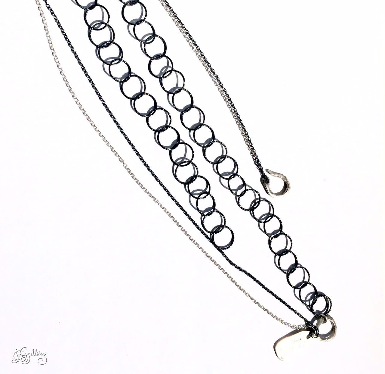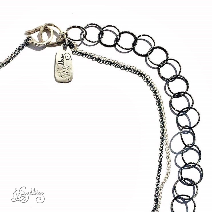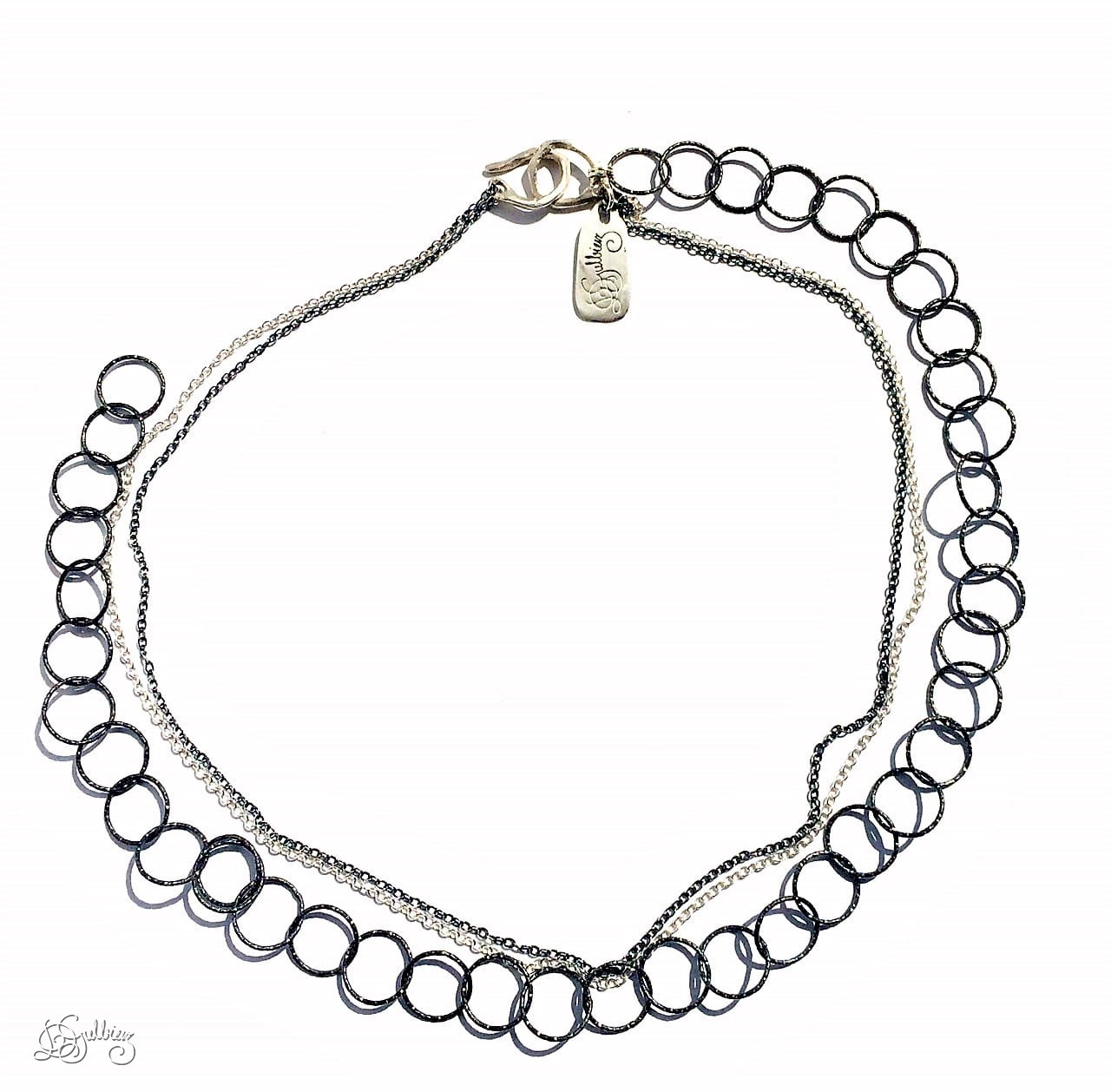 Ten naszyjnik łańcuch to prawdziwy HIT! Dwukolorowy, podwójny, wykonany ze srebra, częściowo oksydowany, o regulowanej długości daje wiele możliwości. Pozwala na dwukrotne oplatanie wokół szyi, założenie łańcucha na rękę w formie bransolety i powieszenie na nim broszki z zaczepem lub innego wisiorka z kolekcji Gulbierz. Dodatkowym atutem jest fantazyjna forma i dołączone dwustronne, ozdobne logo, będące gwarancją marki.