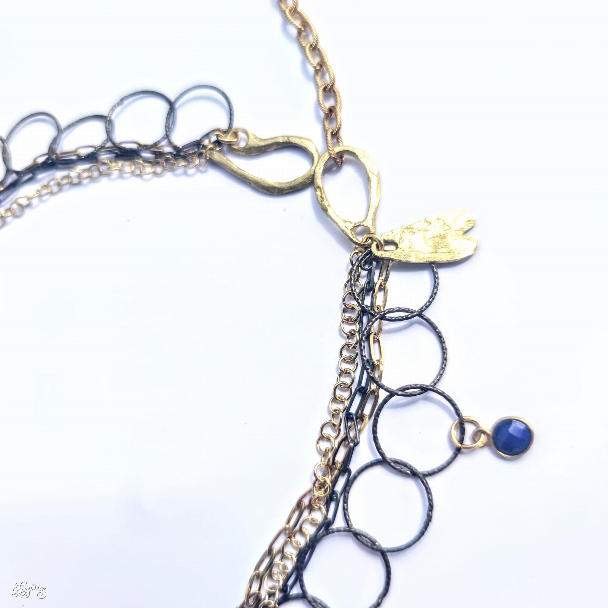 Naszyjnik z Lapis Lazuli to subtelna, minimalistyczna i zarazem fantazyjna ozdoba. Poddana "kutej" autorskiej obróbce podkreśla jej unikatowość. Zawieszona na nowoczesnym wielokolorowym łańcuszku. Zróżnicowane "sploty oczek" łańcucha dodają wyrazu i pozwalają na regulowanie długości.