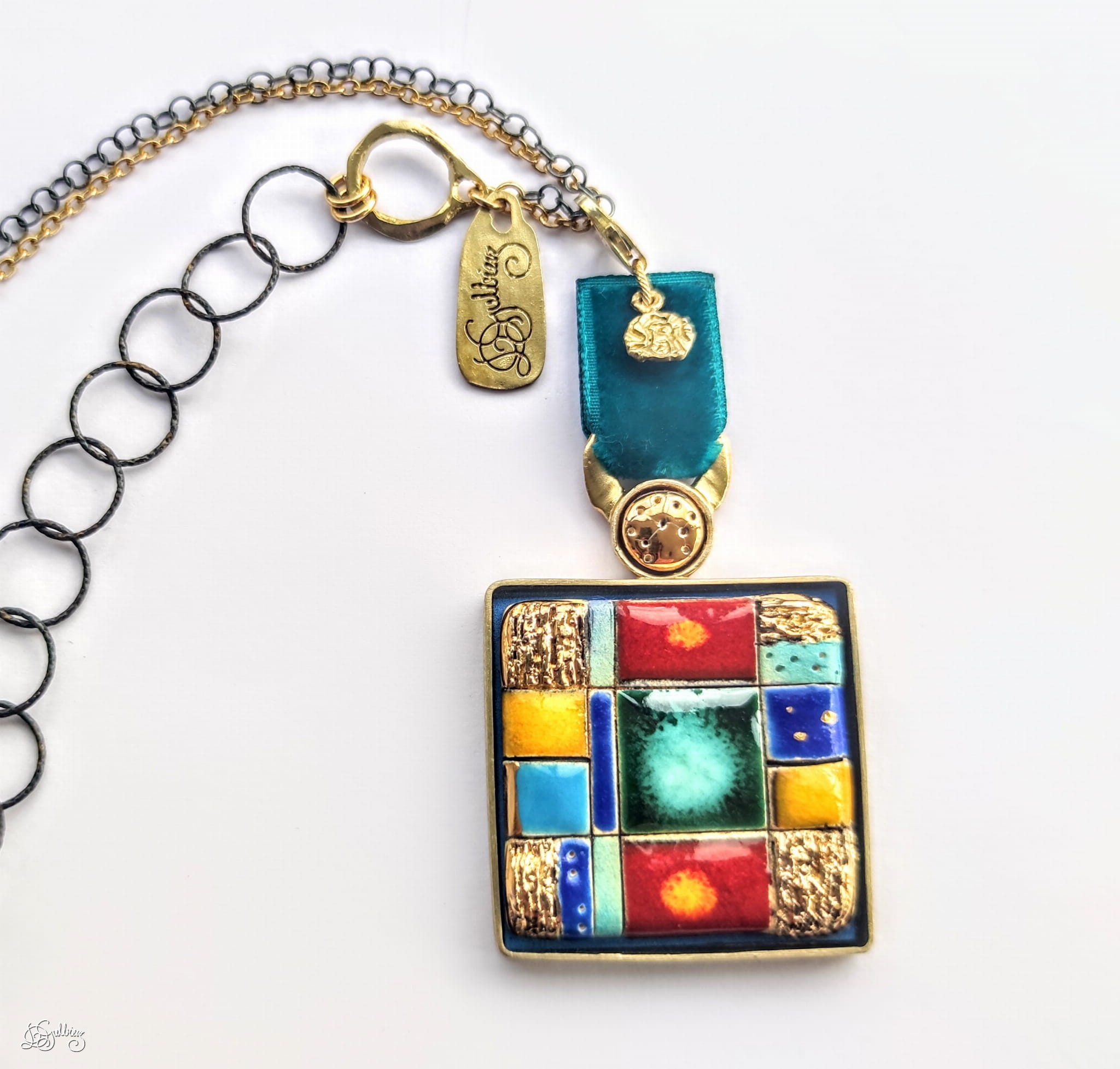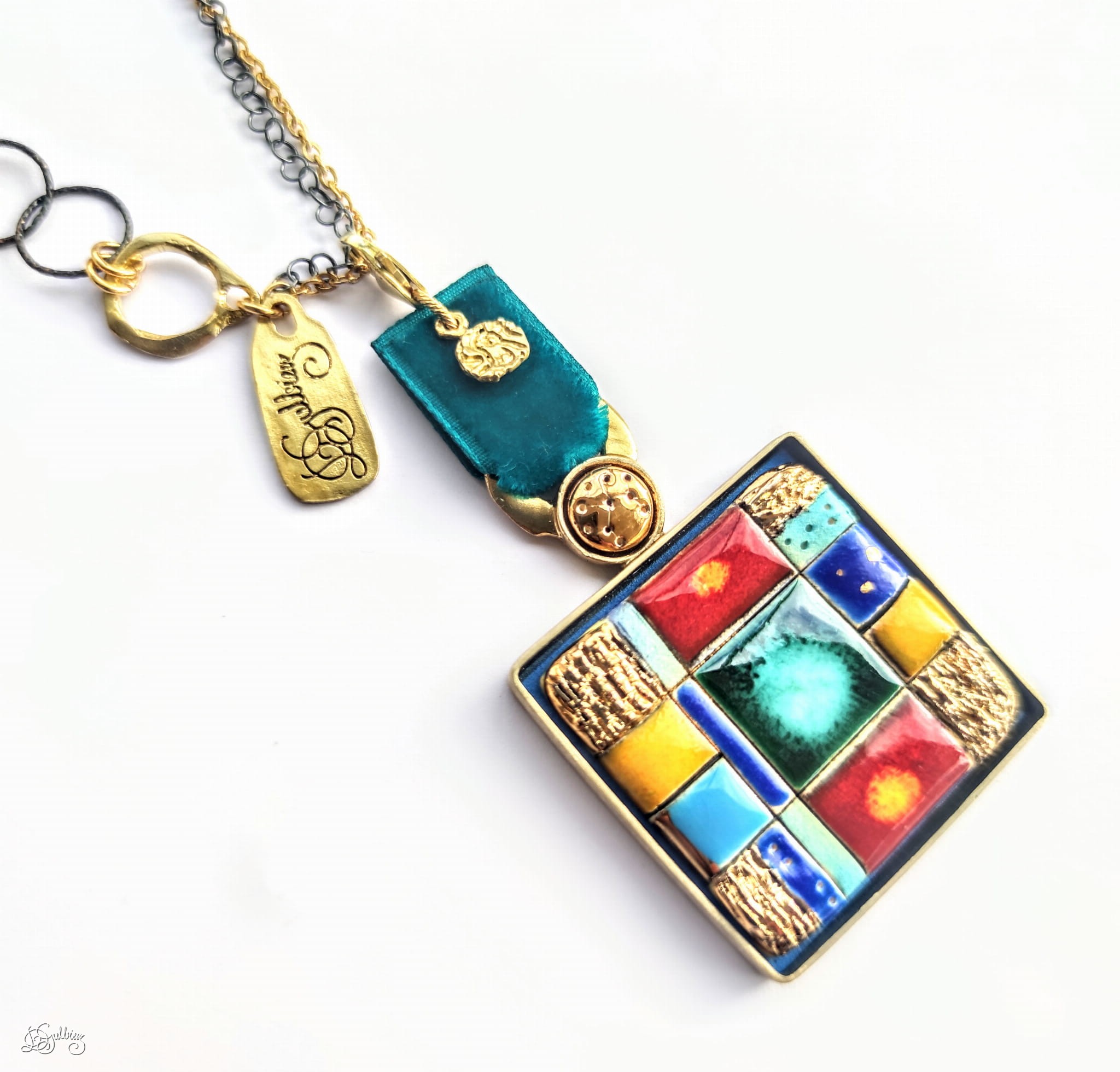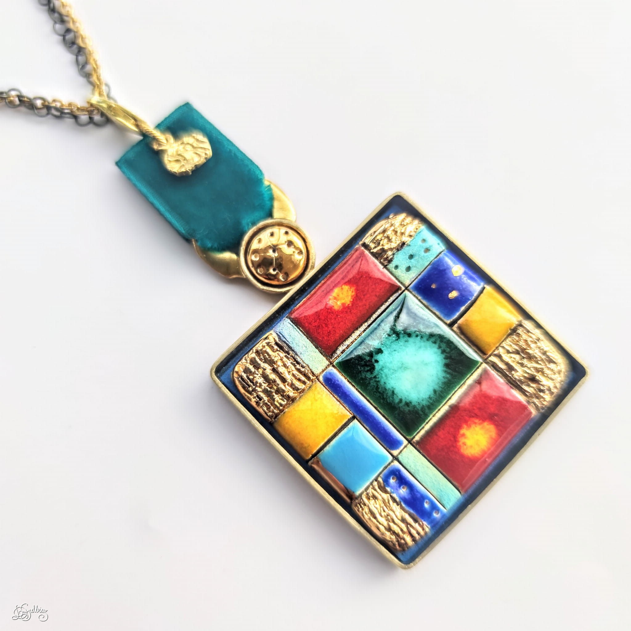 Mozaika Radosna to naszyjnik łączący szlachetne materiały i precyzyjne wykonanie. Ręcznie rzeźbiona, złocona ceramika oprawiona w szczotkowany mosiądz z elementami ze srebra, zawieszona na pęku kolorowych rzemieni tworzy barwny kolaż, który pasuje do wielu kolorów. Głębokie kolory zostały osiągnięte dzięki starannemu procesowi szkliwienia. Naszyjnik może być noszony zarówno na co dzień, jak i na specjalne okazje.