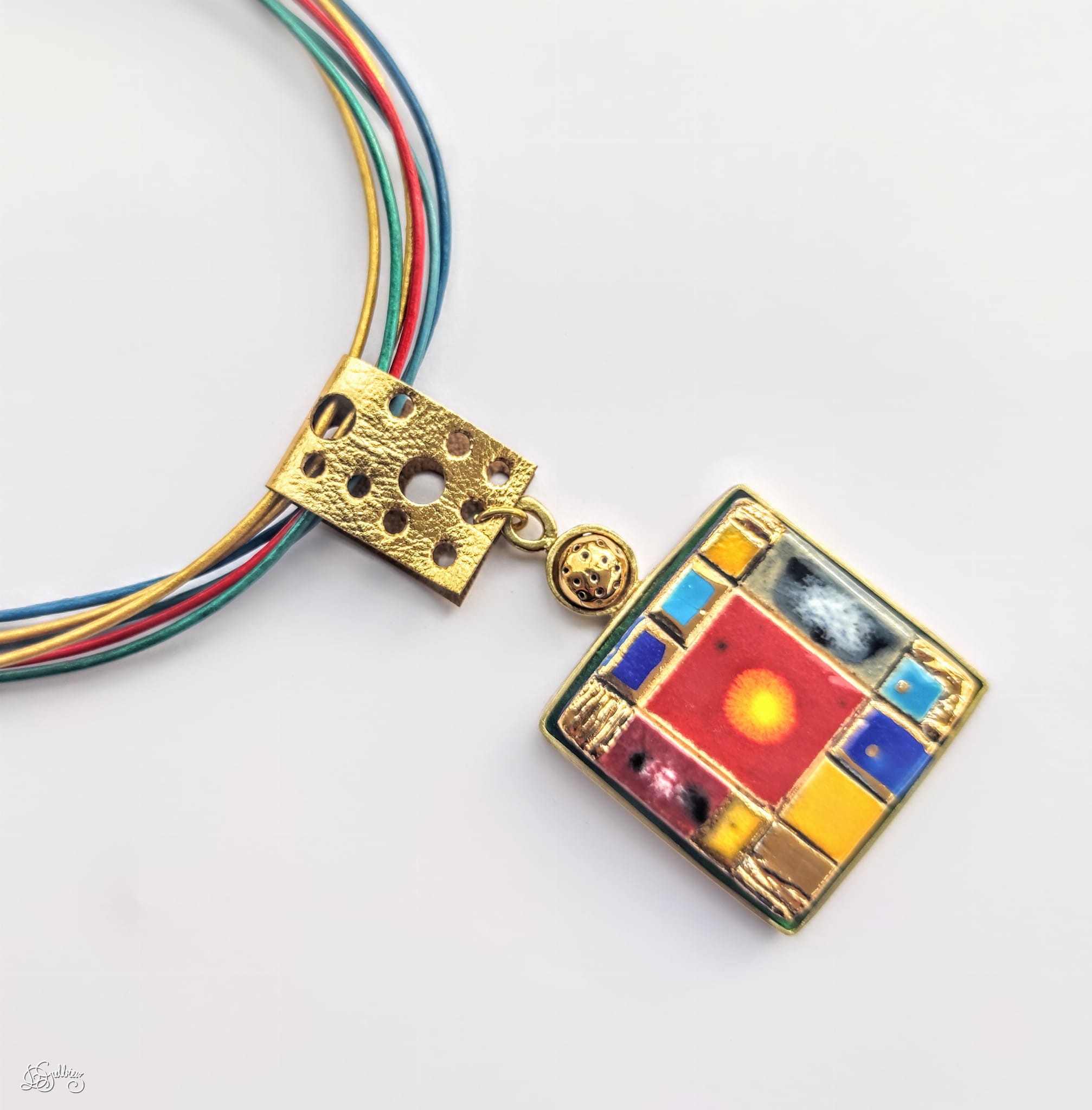 Mozaika Żywiołowa to naszyjnik łączący szlachetne materiały i precyzyjne wykonanie. Ręcznie rzeźbiona, złocona ceramika oprawiona w szczotkowany mosiądz z elementami ze srebra, zawieszona na pęku kolorowych rzemieni tworzy barwny kolaż, który pasuje do wielu kolorów. Głębokie kolory zostały osiągnięte dzięki starannemu procesowi szkliwienia. Naszyjnik może być noszony zarówno na co dzień, jak i na specjalne okazje.