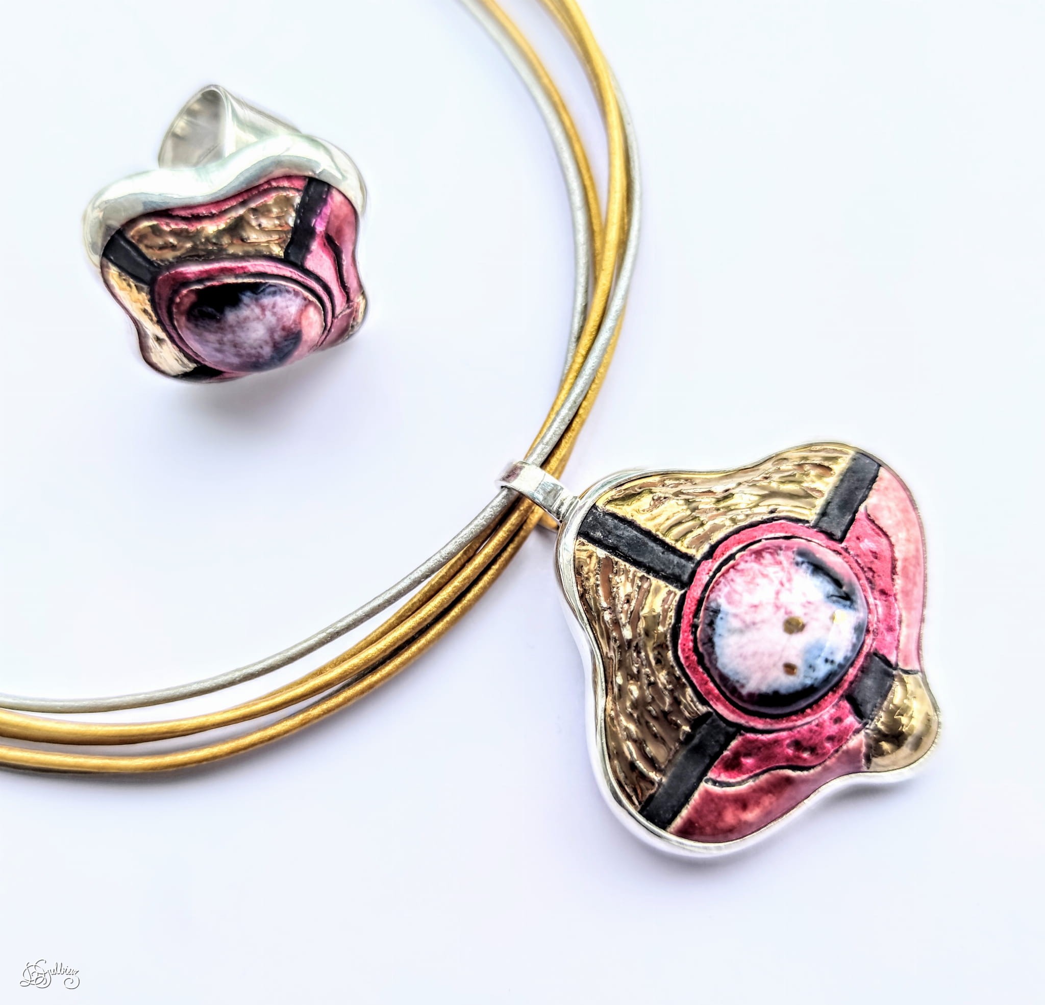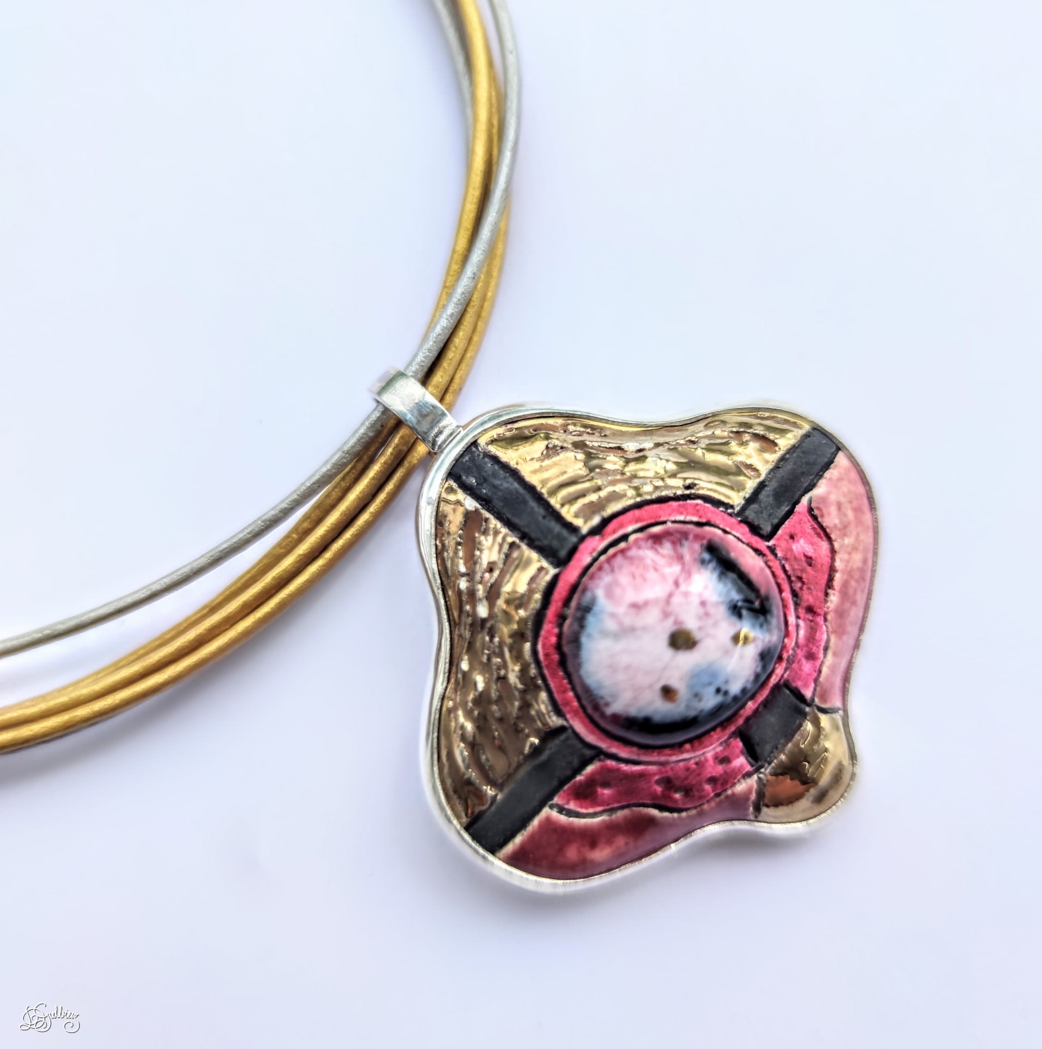 Malowany intensywnymi szkliwami w barwach różu i burgundu oraz miejscowo pokryty złotem i wielokrotnie wypalany porcelanowy naszyjnik oprawiony w polerowane srebro i zawieszony na złoto-srebrnych rzemieniach może być ozdobą codziennego stroju i wieczorowej sukni. Burgund, róż, złoto i srebro tworzą spójną całość i znakomicie podkreślają kobiecą urodę nadając jej szyku. Odręczny autorski podpis na rewersie potwierdza autentyczność marki.